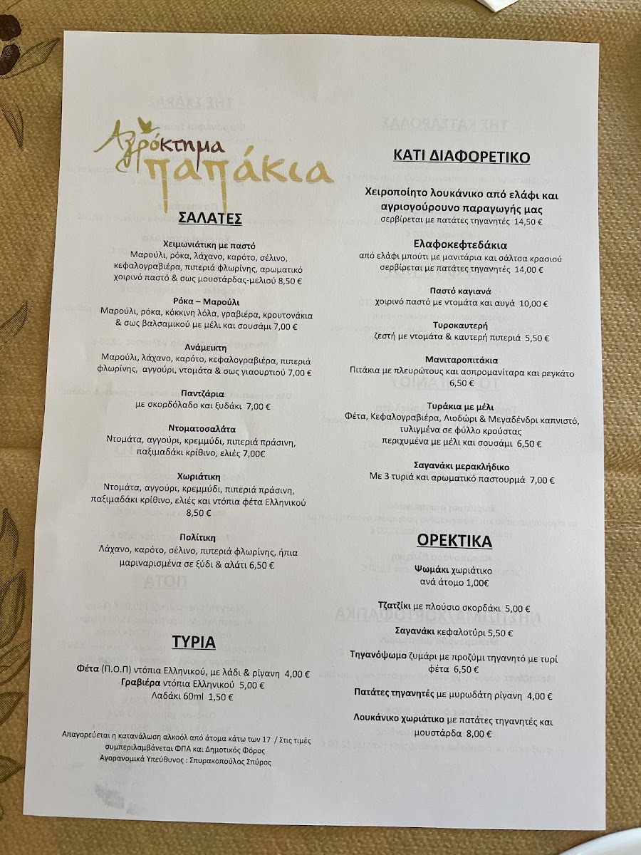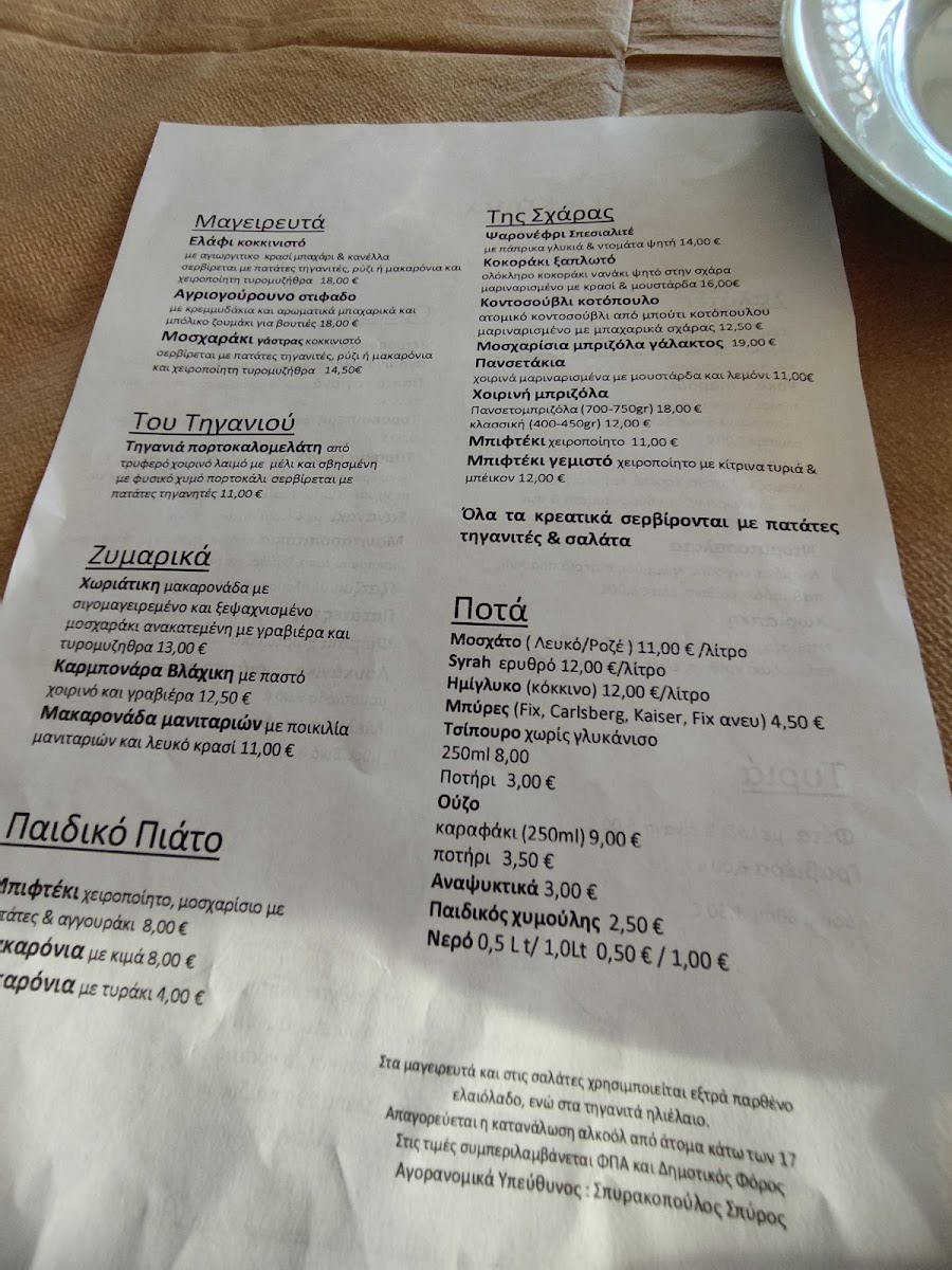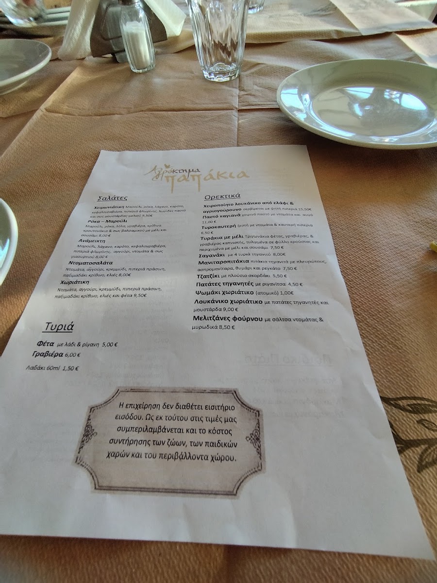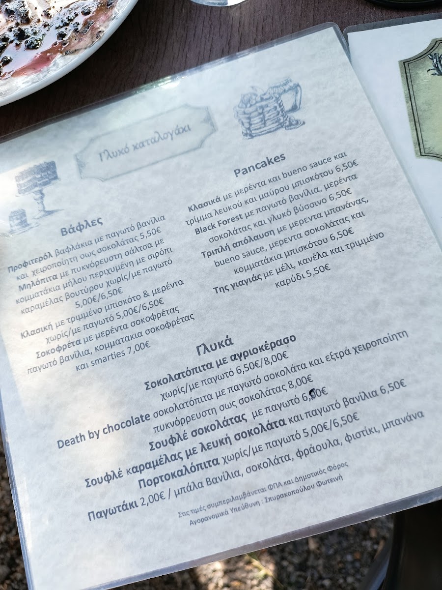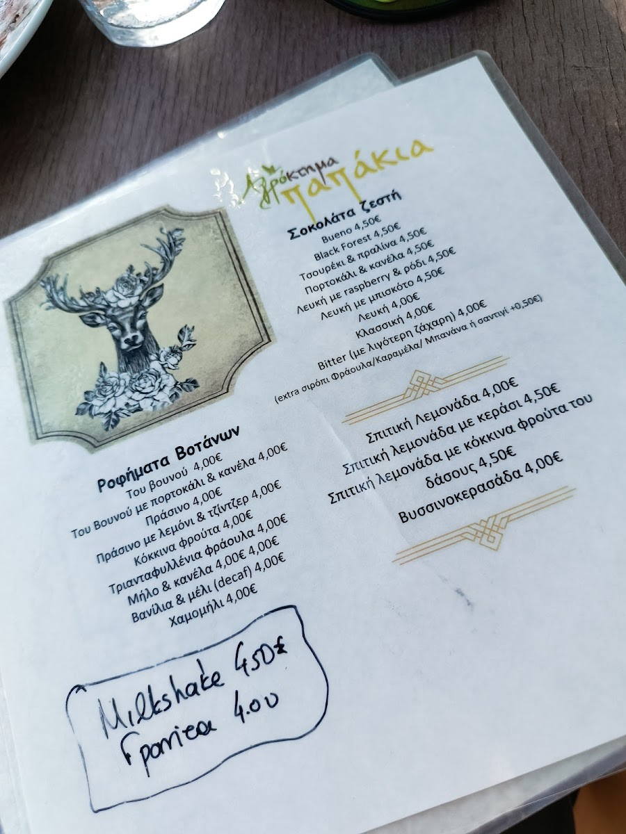 You’ll find traditional Greek fare alongside farm-fresh creations, such as Ελάφι Κοκκινιστό (stewed venison), Σαγανάκι Τυρί (fried cheese), and handmade sausages made from deer and wild boar. Light snacks like Τυροπιτάκια (cheese pies) and desserts like Βάφλα (waffle) and Σοκολατόπιτα (chocolate pie) complement coffees and refreshing drinks throughout the day.